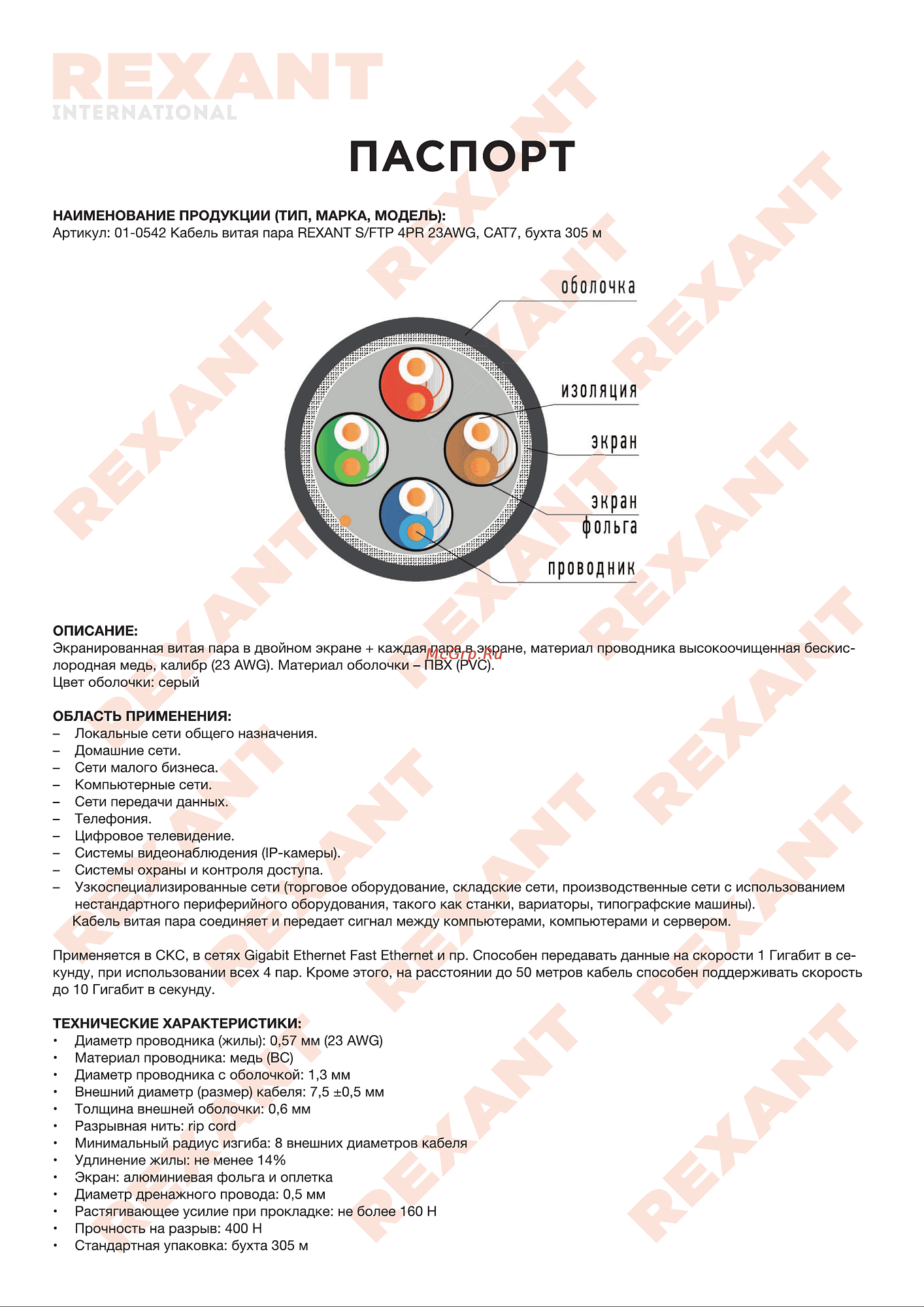| Диаметр проводника | 0,575 мм (23 AWG) |
