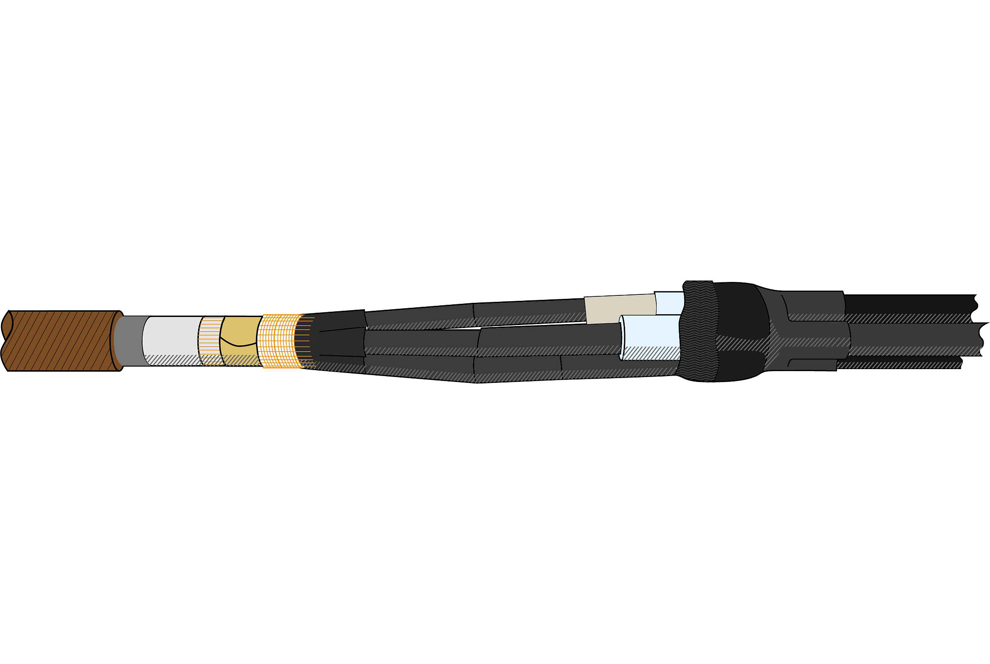 Муфта термоусаживаемая соединительная переходная на напряжение до 10 кВ включительно для соединения 3 экранированных одножильных кабелей с пластмассовой изоляцией из сшитого полиэтилена и трехжильного кабеля с бумажной изоляцией СПТп-10-70...120 (3х1-3)